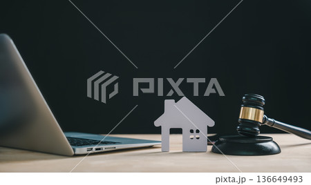 Foreclosure house concept depicting house model, gavel and laptop indicates real estate law, bankruptcy, property auction, home mortgage, legal sale, court, debt issues