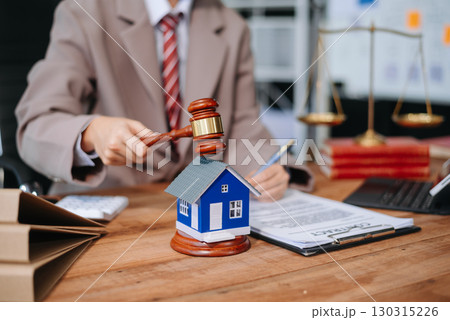 Real Estate Lawyer And House Foreclosure Law. House model, hammer judge gavel on table with white background. Foreclosure, bankruptcy concept