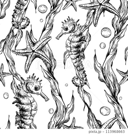 Underwater world clipart with sea animals seahorse, starfish, bubbles and algae. Graphic illustration hand drawn in black ink. Seamless pattern EPS vector.