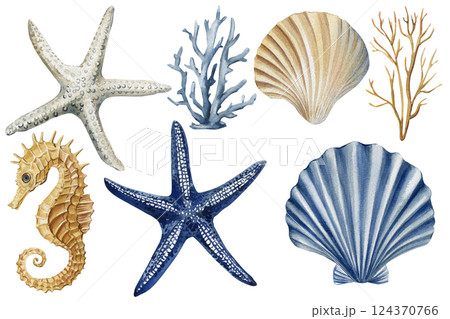 watercolor starfish seahorse coral shells collection, marine ocean creatures, tropical underwater nature illustration