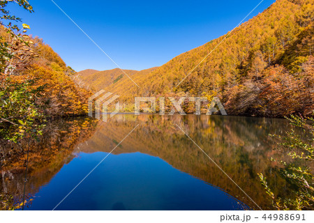 秋の晴れた朝 紅葉の湖