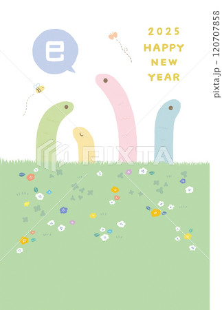 蛇に乗る可愛い干支の年賀状 十二支 2025 線画 手描き