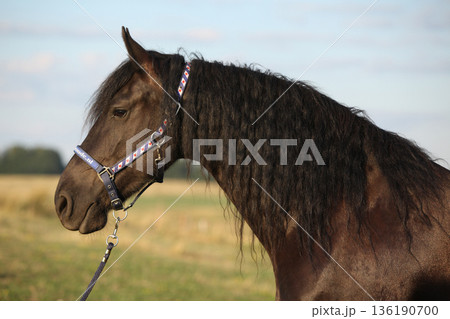 Friesian horse with halter in sunset