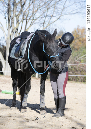 Young sportive girl, professional jockey or horsewoman in sports uniform and helmet with black horse at riding arena. Horseback riding