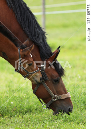 Mother and Foal Horse Together in Pasture Landscape with Greenery. A beautiful portrait of a mare and her foal in a serene pasture