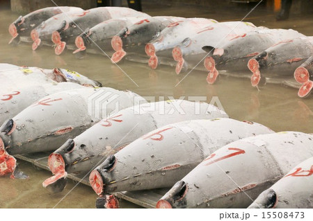 水揚げされたマグロ 鮪競り市場の風景 並べられたマグロ たくさんの鮪