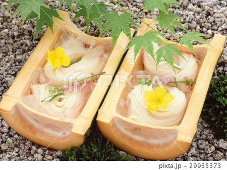 天然の竹に盛り付けたそうめん 夏イメージ