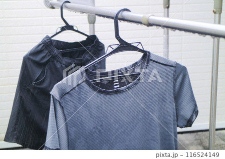 物干しスタンドの水滴と雨に濡れた洗濯物