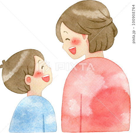 笑い合う後ろ姿の親子の水彩イラスト(母親と男の子)