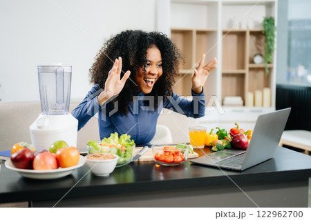 Smiling woman in a modern kitchen with fresh fruits, vegetables, blender, and orange juice, promoting clean