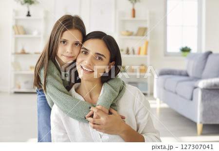 Portrait of smiling happy young mother with teen daughter looking at camera at home.
