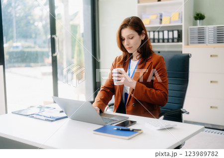 Confident business expert attractive smiling young woman typing laptop and holding digital tablet on desk