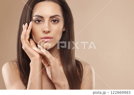 Beautiful young woman with clean fresh skin on beige background, Face care, Facial treatment, Cosmetology, beauty and spa, women portrait.