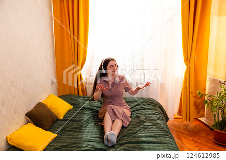 Joyful young woman swaying to the melody, fully present in her happiness. Wide shot