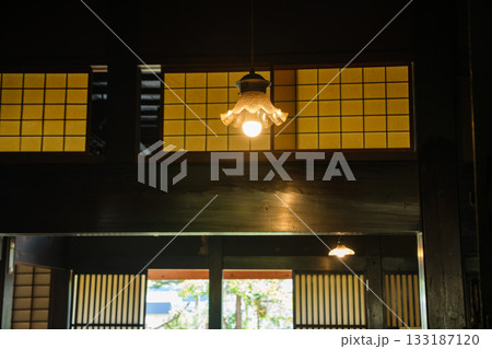木造家屋から吊るされた古典的な明かり(ガラスの笠と電球)