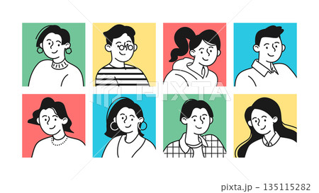 GenZ・Z世代の男女集合・笑顔とニュートラル表情の線画イラストセット