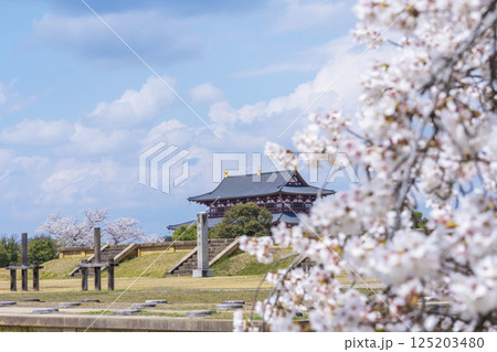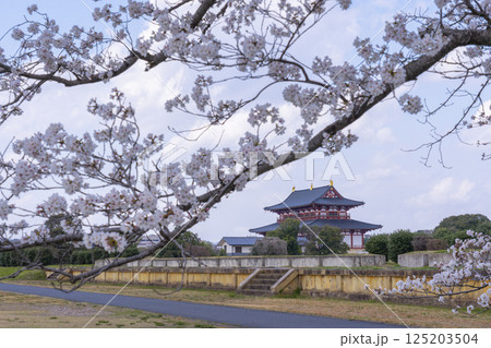 第二次大極殿跡の基壇と第一次大極殿に桜
