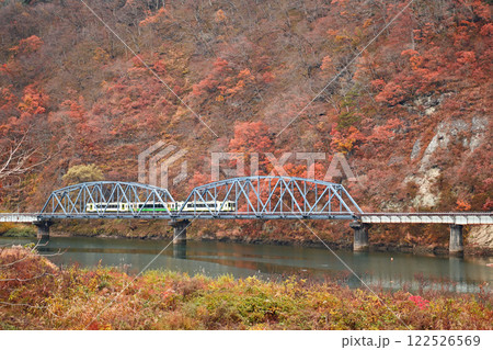 只見線 秋の第八只見川橋梁を渡る特別列車「風っこ只見線紅葉号」(福島県只見町、10月)