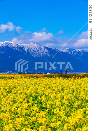満開の菜の花と冠雪の山並み、滋賀県守山市の早咲き菜の花畑、第1なぎさ公園の菜の花