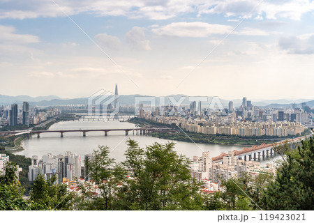 Seoul cityscape overlooking Han River and Lotte World Tower