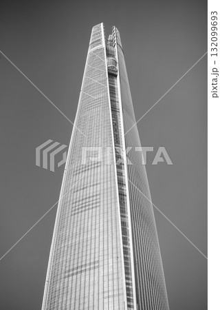Black and white view of Lotte World Tower, 555 m supertall skyscraper, located in Songpa District of Seoul, South Korea