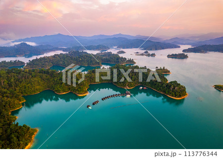 Sunset over mountain and raft resort in tropical rainforest on dam at Kanchanaburi