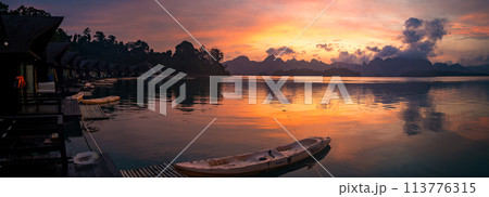 floating house resort at sunrise in Srinakarin Dam, Kanchanaburi