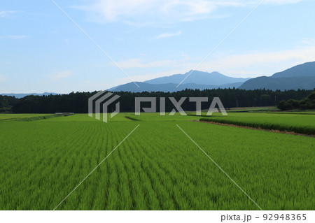田植えが終わったばかりの青空を映す水田と遠く筑波山