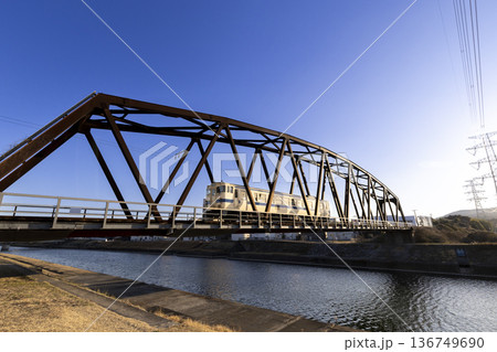 宝満川にかかる鉄橋を渡る筑豊本線の汽車