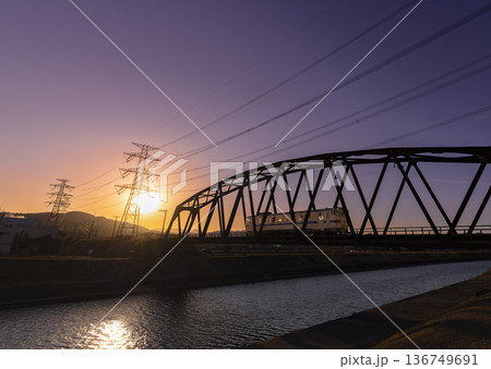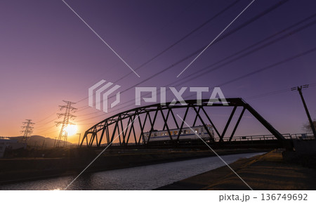 夕日の中、宝満川にかかる鉄橋を渡る筑豊本線の汽車