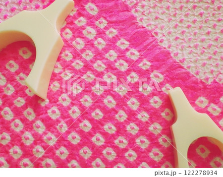 箏柱とピンク色の鹿の子絞の絹布