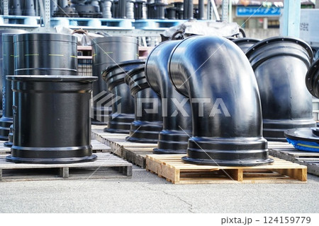 水道管を並べて置いている資材置き場の様子