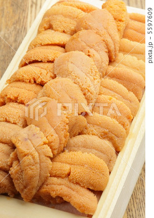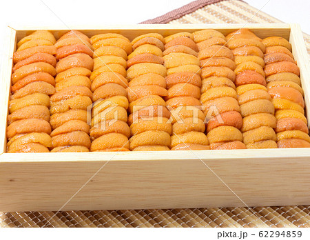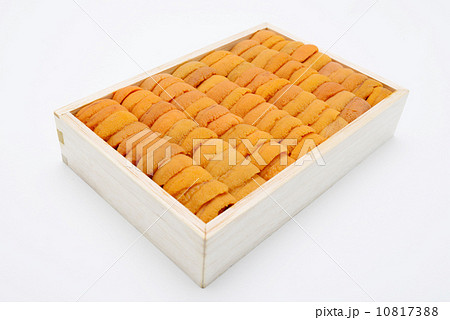 木箱に入ってる高級食材のウニを白背景で俯瞰撮影