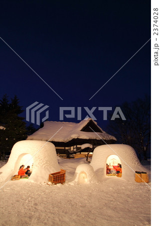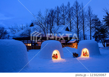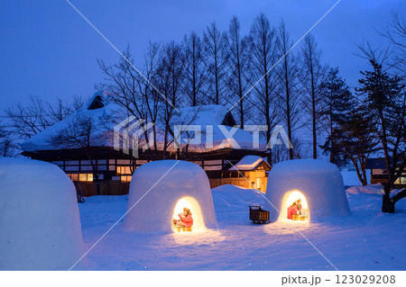 ライトアップされた かまくらと古民家 秋田県
