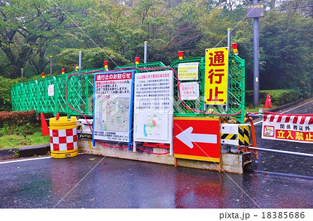 神奈川県観光スポット・大涌谷三叉路から大涌谷への通行止め交通バリケード・縦位置