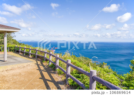 日本 三重県鳥羽市のパールロード沿いにある鳥羽展望台から見える太平洋と海女のテラス