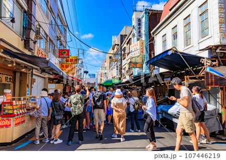 東京 中央区 観光客で賑わう築地場外市場(もんぜき通り)