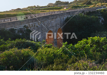 Historic stone bridge along Victoria Lines in Malta, glowing arches at sunset, green valley and shrubs in foreground