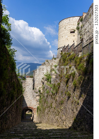 Torre Coltrina of Brescia Castle rises above limestone walls and Strada del Soccorso passage