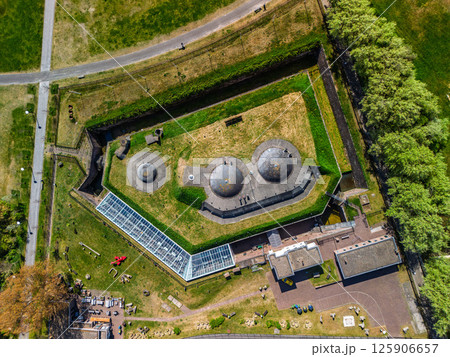 Rotterdam, South Holland, Netherlands - 09.07.2024: Aerial view of historic fort with round domes green grass-covered walls, walking paths, and adjacent buildings surrounded by trees and open parkland