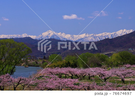 長野県長野市篠ノ井東福寺 北アルプス、千曲川、花桃の景色