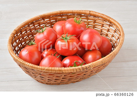 トマト、フルーツトマトの食材イメージ、篭盛り、たくさん、新鮮、緑黄色野菜。
