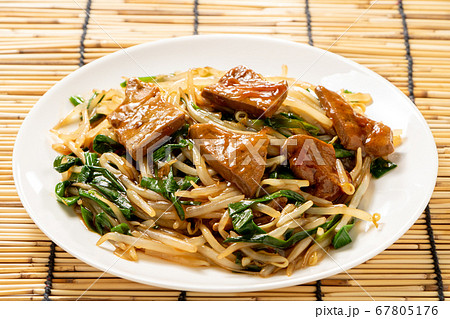 レバニラ炒め。背景すだれで夏のスタミナ料理イメージ。