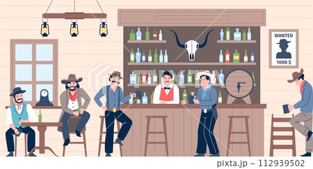 Cowboys in bar. Wild west style male characters drinking alcohol in pub. Cowboy wear traditional hat and outfit. Texas lifestyle. Recent vector scene