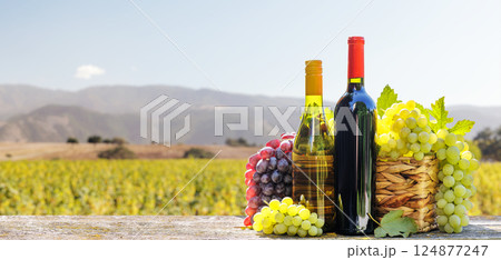 Red and white wine bottles with a grape basket, set against a picturesque vineyard landscape