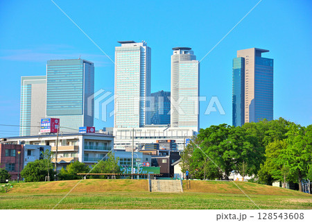 名古屋市、米野公園と名古屋駅前超高層ビル群の風景