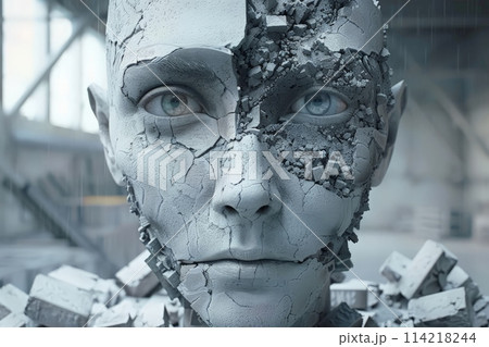 A woman with a shattered face, featuring broken parts and fractures on her skin, conveying a message of inner turmoil and pain.