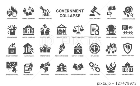 collection icons collapse government institutions societal order, falling podium crumbling capitol