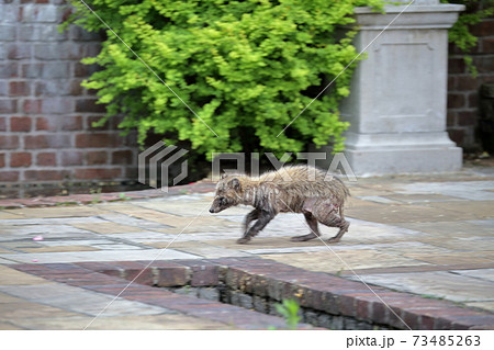 痩せ干せて毛が抜けた野生動物(タヌキ ホンドタヌキ(カイセン症の疑い))