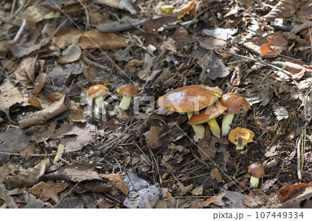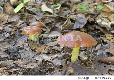 自然 茸 チチアワタケ、傘の内側は黄色で襞ではなく管孔があり柄にも黄色い粒々がります